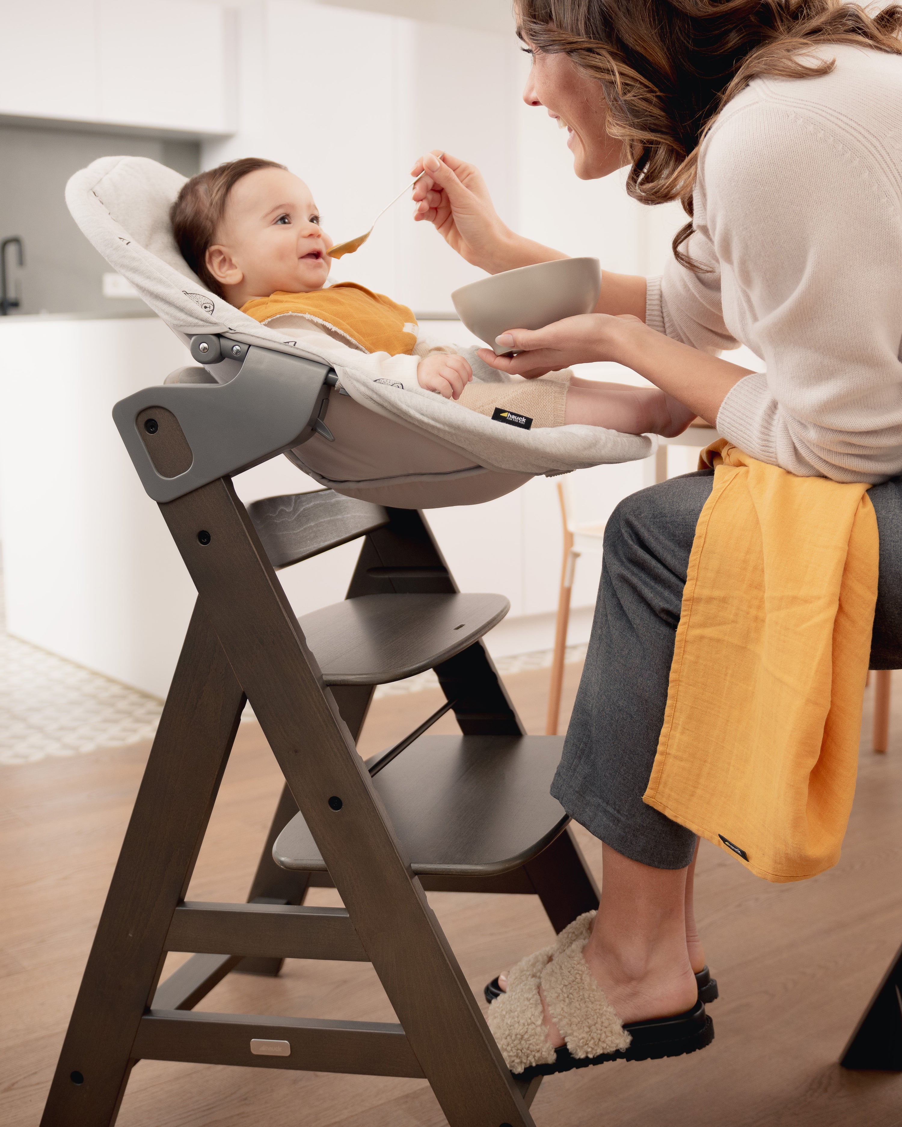 This may be sitting in a highchair or booster seat with their back supported, or being held while sitting on your lap – either way baby needs to be able to sit upright with a straight, clear passage from mouth to stomach.
