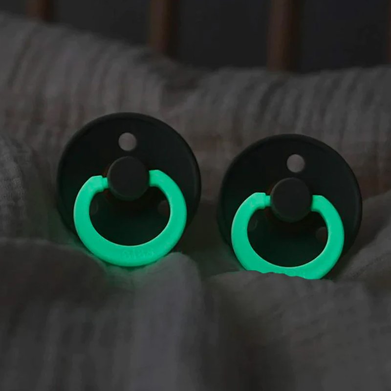 BIBS Colour GLOW has the same high quality as the original BIBS pacifiers but has a practical glow feature. The glow feature makes it easy for both parents and little ones to find the pacifiers in the dark and accommodates the frustration it can cause for parents to stand in the middle of the night - in total darkness - looking for the pacifier with a crying child. Simply hold the pacifier up to a lamp for 5-10 sec. to activate the effect. The luminescent effect lasts for 8+ hours.