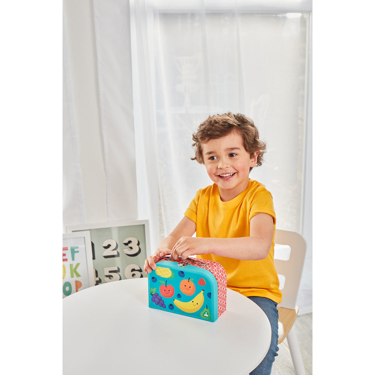 Children can make their own packed lunch to eat while out and about. They are sure to enjoy lots of roleplay fun as they make two tasty sandwiches to share with their teddies. For dessert, they can peel the lid off the pot of yoghurt and then cut the orange in half. There is also a pot of raisins if they need a snack for the afternoon.