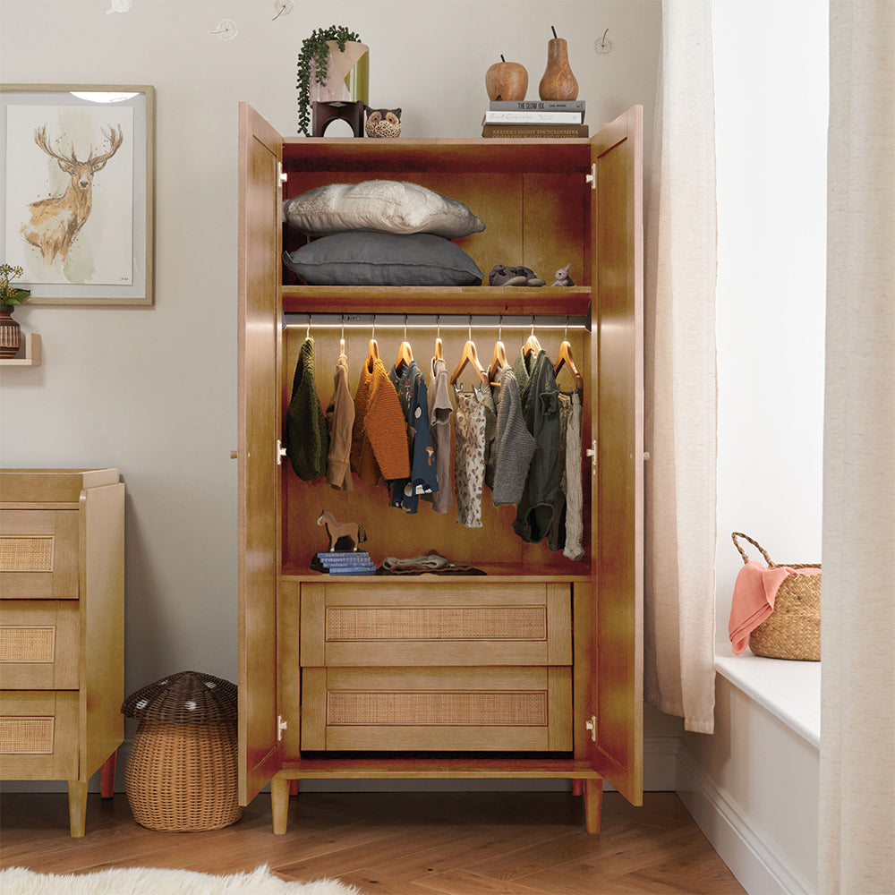 The Japandi Wardrobe is both stylish and practical, offering ample and versatile storage space, with shelving, soft-close drawers and hanging rail with LED sensor light. A fusion of Japanese and Scandi style, the design embodies a sense of tranquillity, for a serene and sophisticated nursery look.