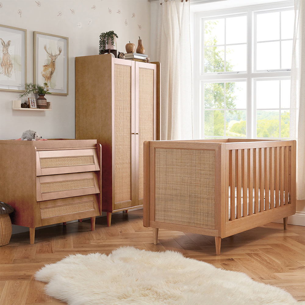 The Japandi 3 piece set includes the Japandi Cot Bed, Chest Changer & Wardrobe.