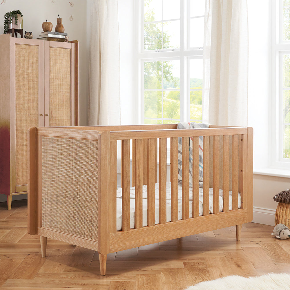 Crafted with a harmonious blend of natural rattan and wood textures, the Japandi Cot Bed is both stylish and practical, offering 3 adjustable mattress heights and conversion to toddler bed or sofa mode. A fusion of Japanese and Scandi style, the design embodies a sense of tranquillity, for a serene and sophisticated nursery look.