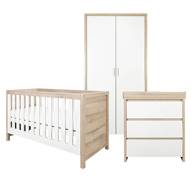 Featuring a clean, contemporary style and finished in modern white and oak, this Modena nursery furniture set offers plenty of storage space for your baby essentials. The nursery set contains a full sized cot bed, nursery chest of drawers with changer and a baby wardrobe.