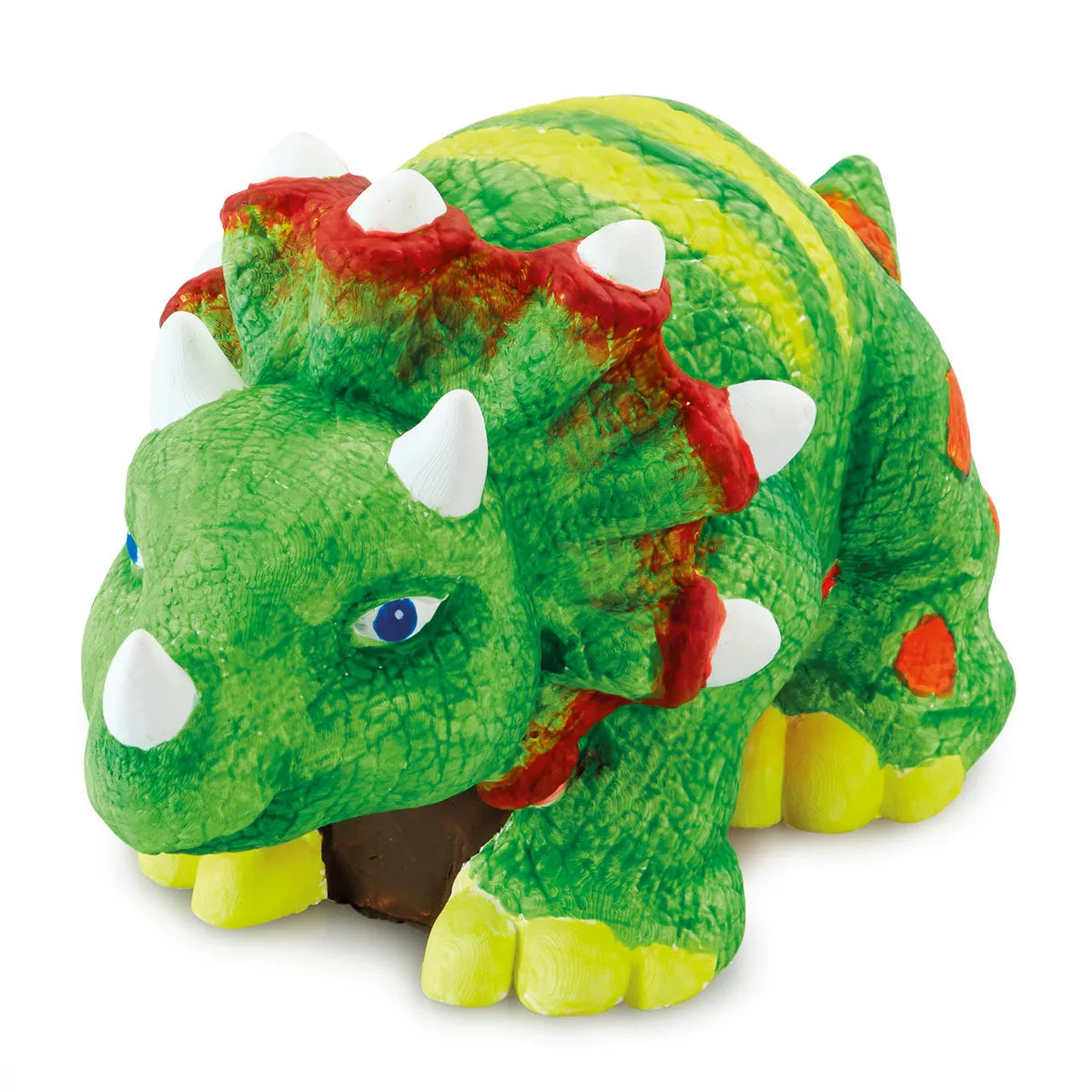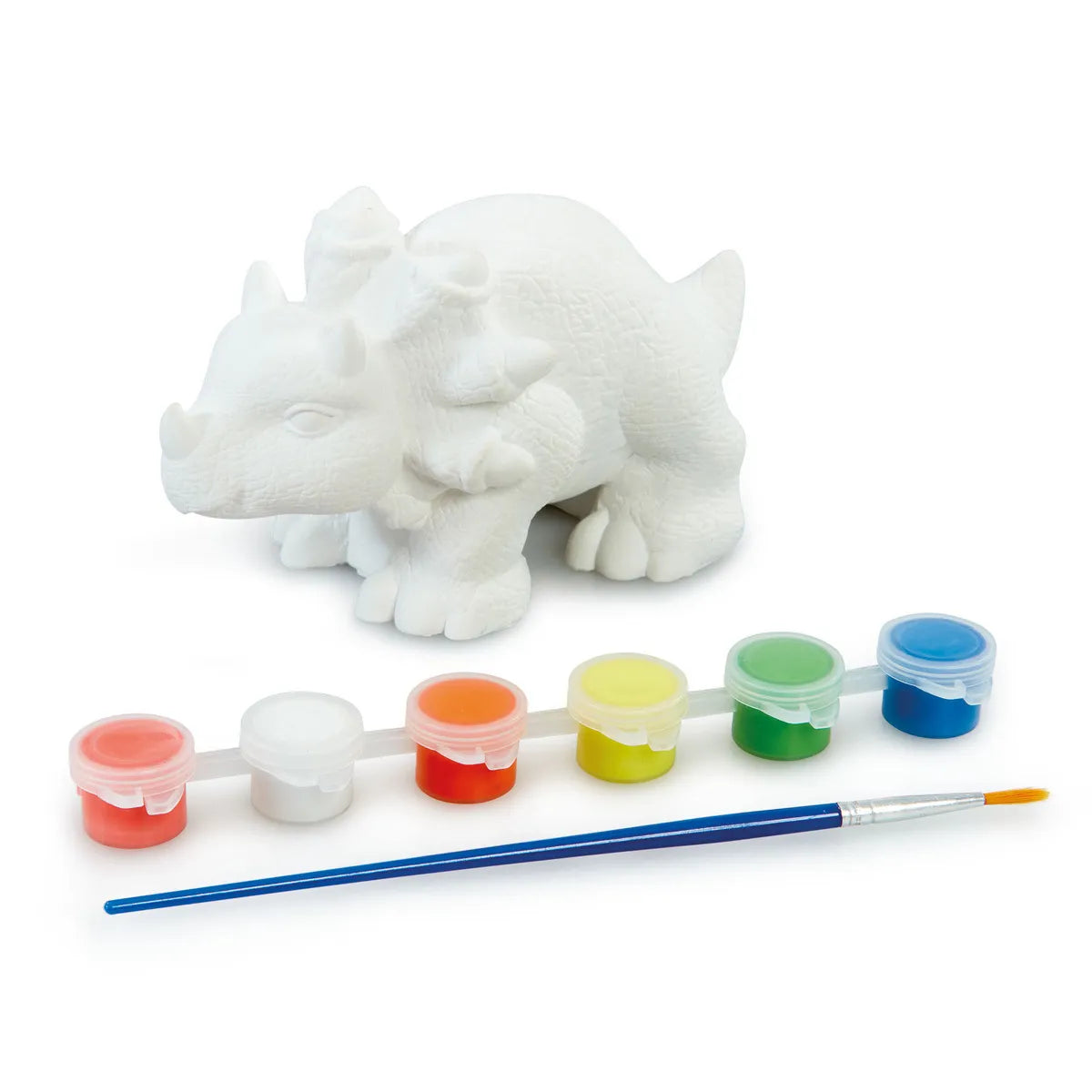 This little triceratops is ready for its new look. Explore your creative side and give him a fresh new style. Simply use the included paints to design and create your dinosaur. Will it have green skin with yellow stripes? Or will you use the provided colour chart to mix your paints and create a dinosaur from outer space with purple horns and an orange tail!